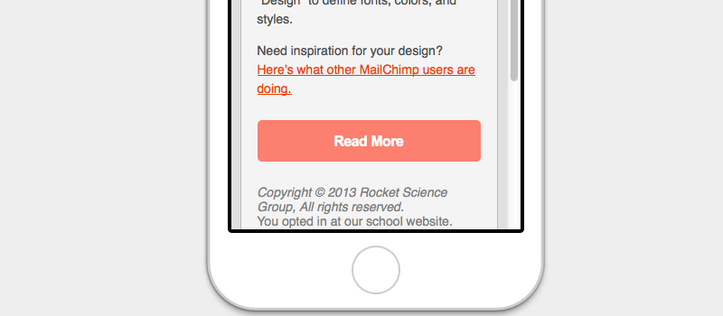 В некоторых ситуациях может быть полезно, чтобы кнопка в электронном письме занимала всю ширину экрана на мобильных устройствах. В то время как правшам удобнее нажимать большими пальцами на левую сторону экрана телефона, левшам удобнее нажимать на правую. В случае с таким сильным призывом к действию, как кнопка, облегчение нажатия может быть полезным для любого пользователя.