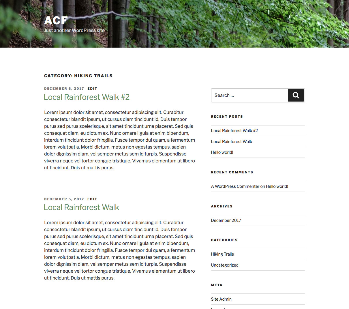 Ниже показано, как приведенный выше код заставляет выглядеть сайт в браузере. Обратите внимание, что изображение заголовка сайта теперь отражает изображение категории, а заголовки всех записей окрашены в зеленый цвет.