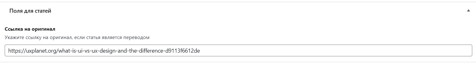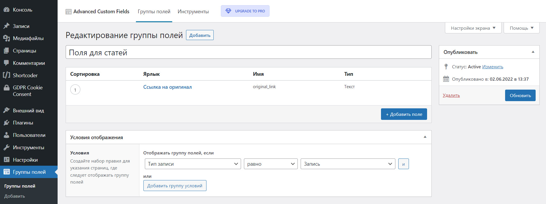 На скриншоте выше видно, что мы создали группу полей «Поля для статей» и в этой группе мы добавили поле «Ссылка на оригинал» со слагом original_link и с условием: