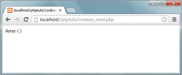 Откройте веб-браузер и введите URL-адрес http://localhost/phptuts/cookies_read.php. На данный момент отображается только пустой массив.