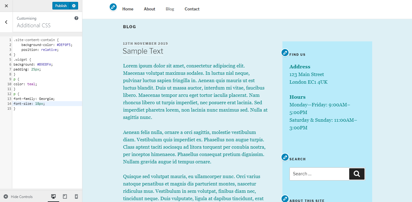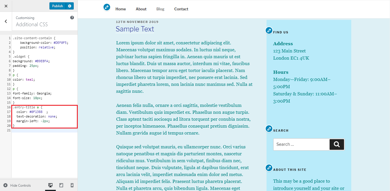 2. Найдите нужную часть с помощью CTRL+F и скопируйте код на вкладку Additional CSS. Измените значения соответствующим образом.