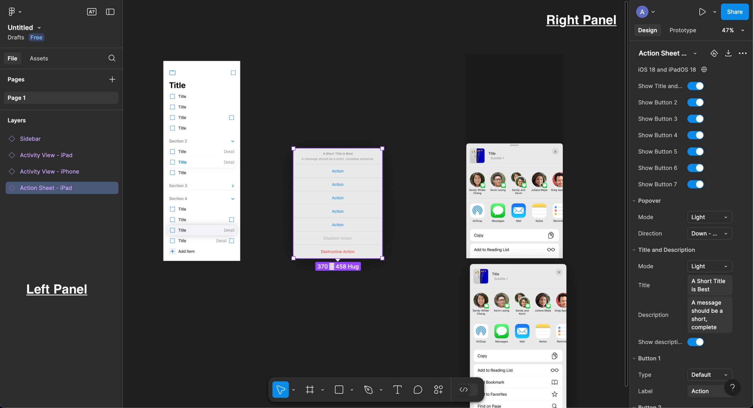 С другой стороны, секции используются для организации элементов дизайна на более высоком уровне, аналогично тому, как секции в HTML организуют различные части веб-страницы. Секции позволяют более организованно группировать связанные между собой рамки и элементы, особенно в больших многостраничных проектах. Это может быть чрезвычайно полезно при управлении сложными проектами, которые имеют несколько экранов или областей дизайна, упрощая переход между секциями или организацию иерархии дизайна.