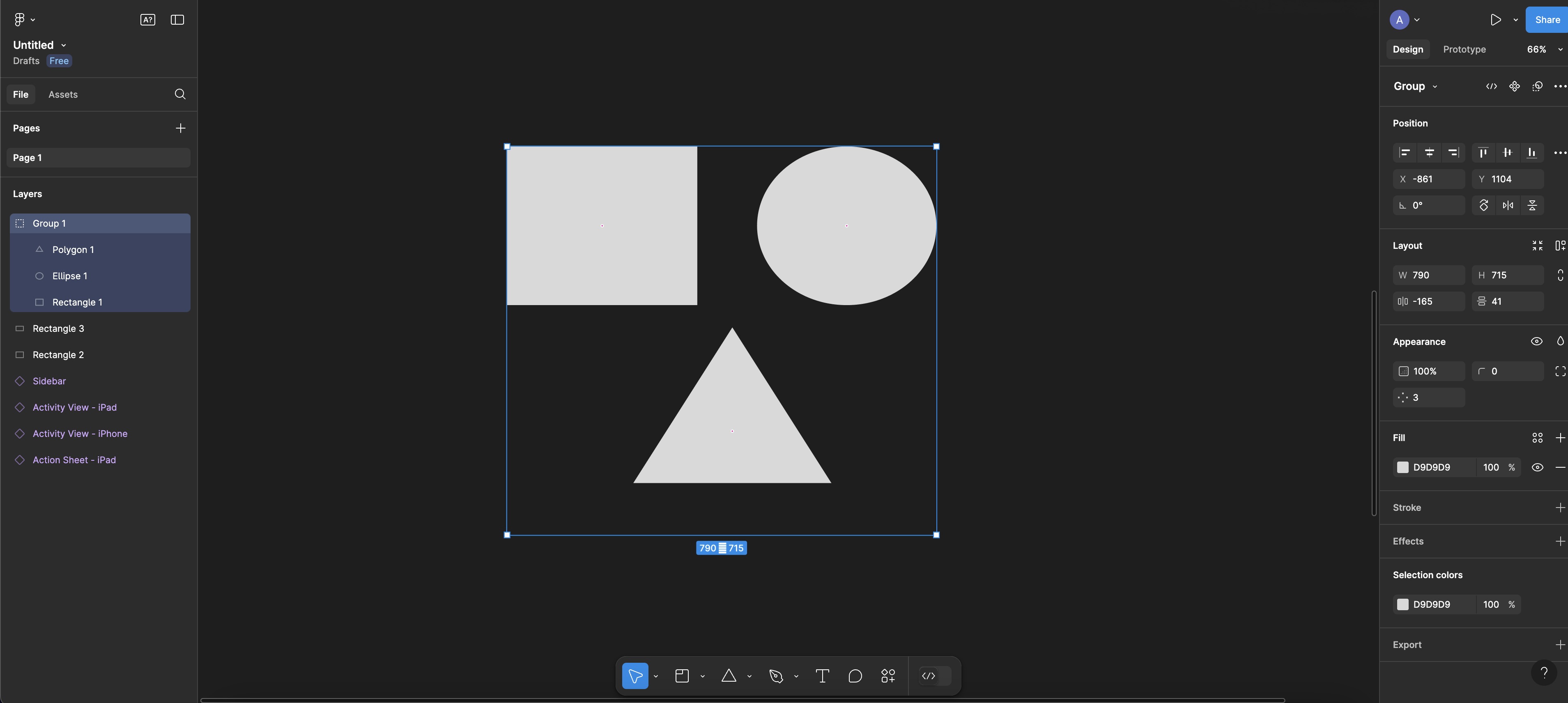 Группы — это более простой способ организации элементов в Figma. Они похожи на неструктурированные кластеры элементов, которые не влияют на правила макета. Например, если вы сгруппируете набор кнопок, вы сможете перемещать их как единое целое, но они не будут вести себя как адаптивный макет. Чтобы сгруппировать элементы, выберите их и нажмите ⌘G (Ctrl + G в Windows).