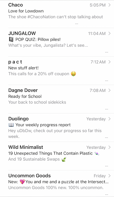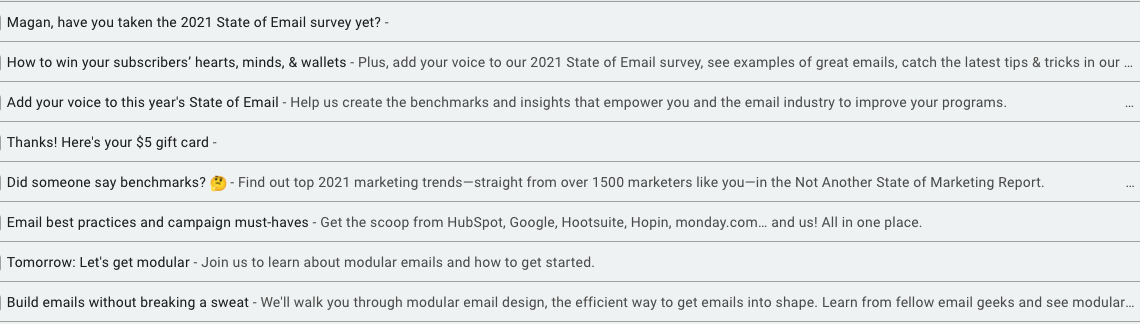Популярность этого хака растет, но есть еще много брендов, которые пока его не используют. Так что пробуйте и смотрите, но никогда не оставляйте строку темы письма на произвол судьбы, поэтому возьмите под контроль и текст прехедера.