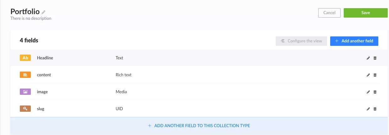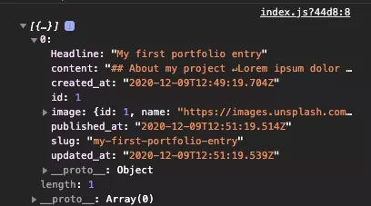 Если вы перейдете по адресу http://localhost:1337/portfolios, вы увидите нашу недавно созданную запись портфолио в формате JSON.