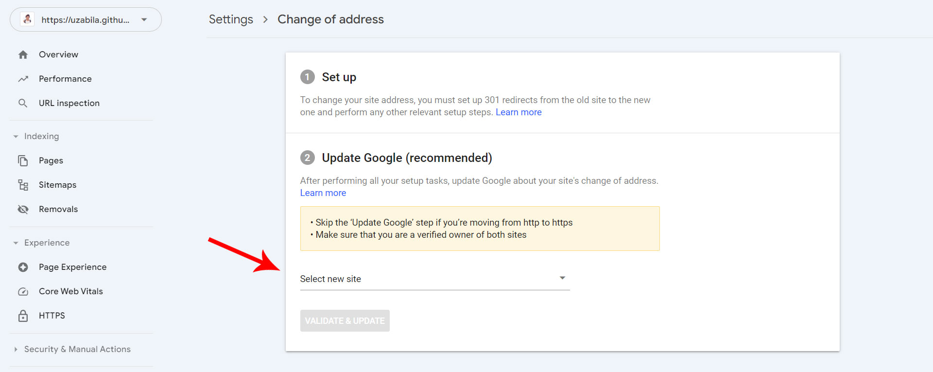 Вы можете переместить доменную собственность только для тех доменов, к которым у вас есть доступ в Google Search Console. После выбора сайта нажмите кнопку «Проверить и обновить» (Validate & Update).