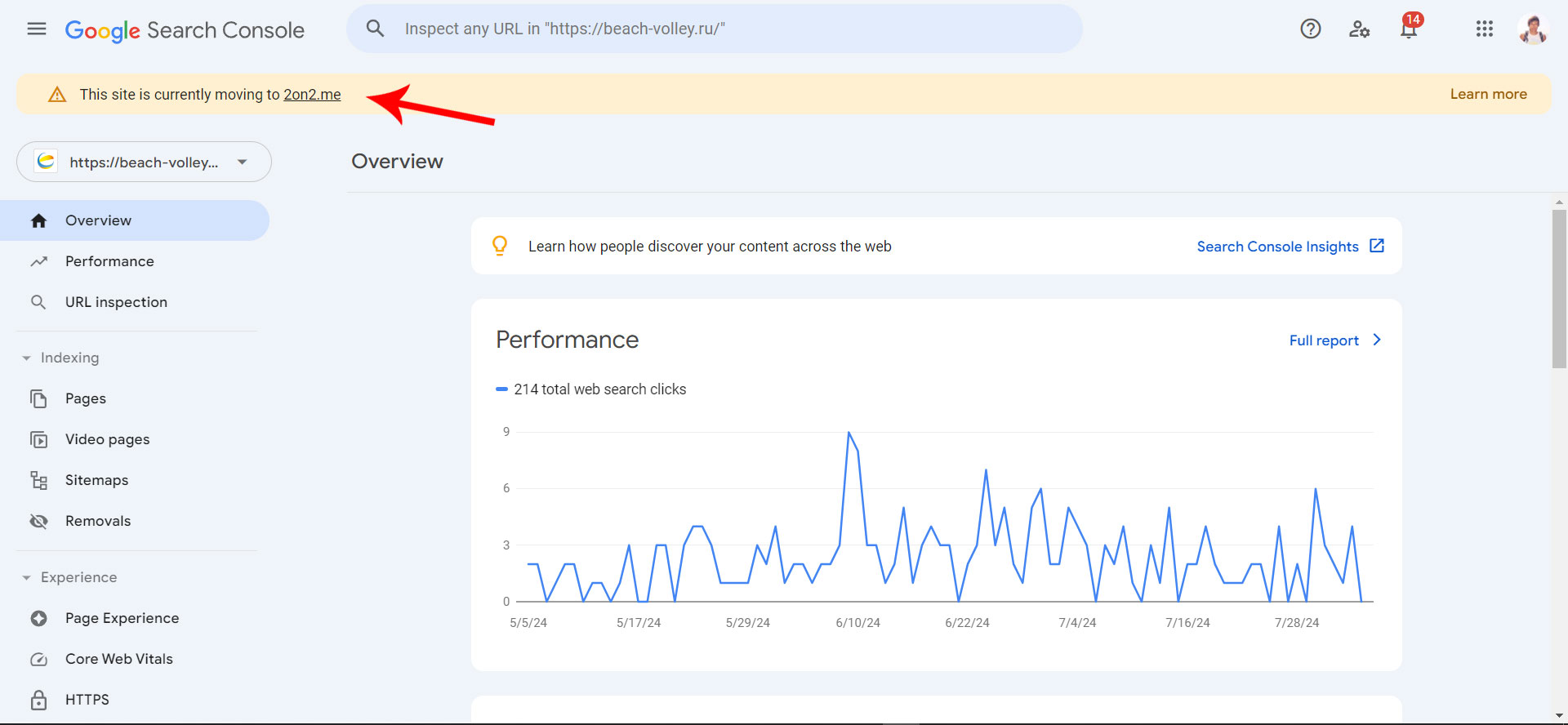 Через некоторое время вы увидите уведомление о смене адреса внутри перенаправленного объекта (домена, доменной собственности).