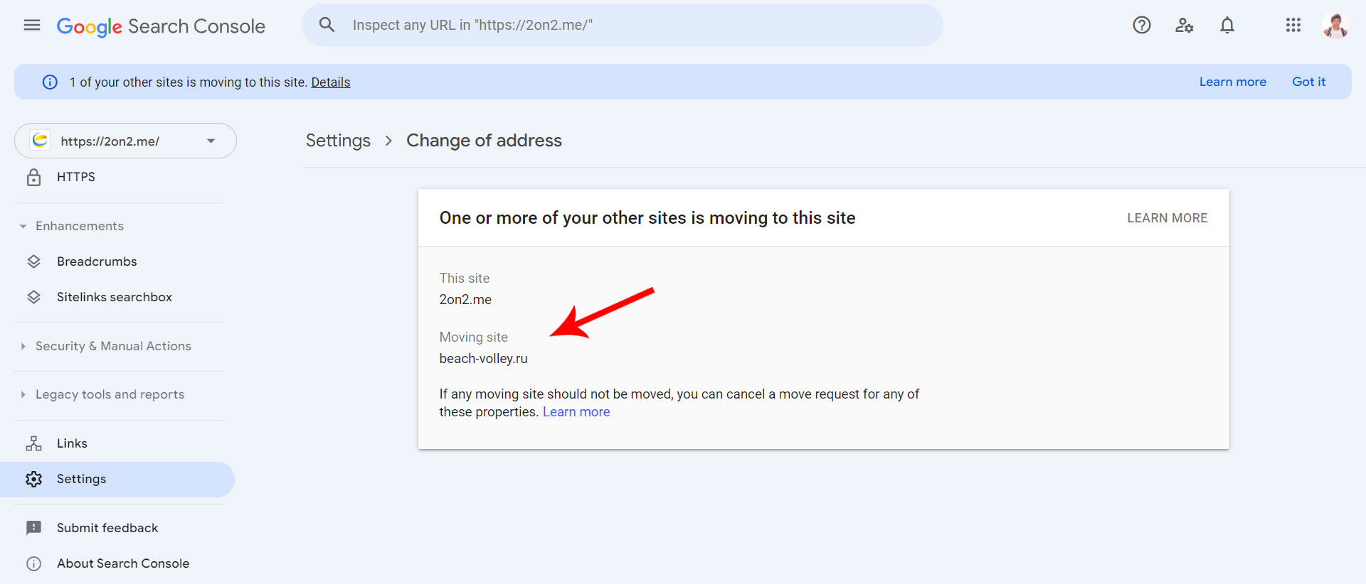 Вы также можете посетить опцию «Смена адреса» (Change of address) в «Настройках» (Settings) нового домена и найти информацию обо всех переезжающих сайтах на этот домен.