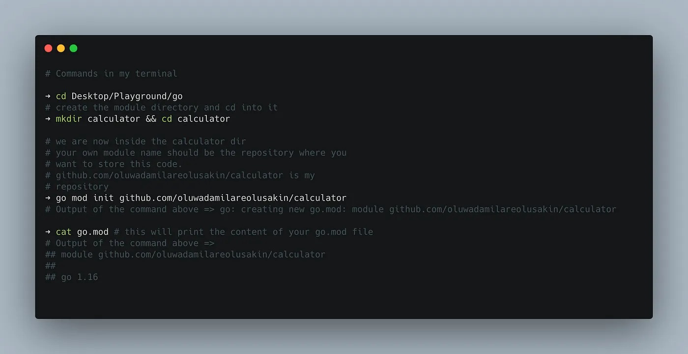 Вы, вероятно, задаетесь вопросом о том, что такое go.mod. Если вы работаете на JavaScript, создание файла go.mod похоже на запуск yarn init или npm init, который вы просто выполняете в терминале.