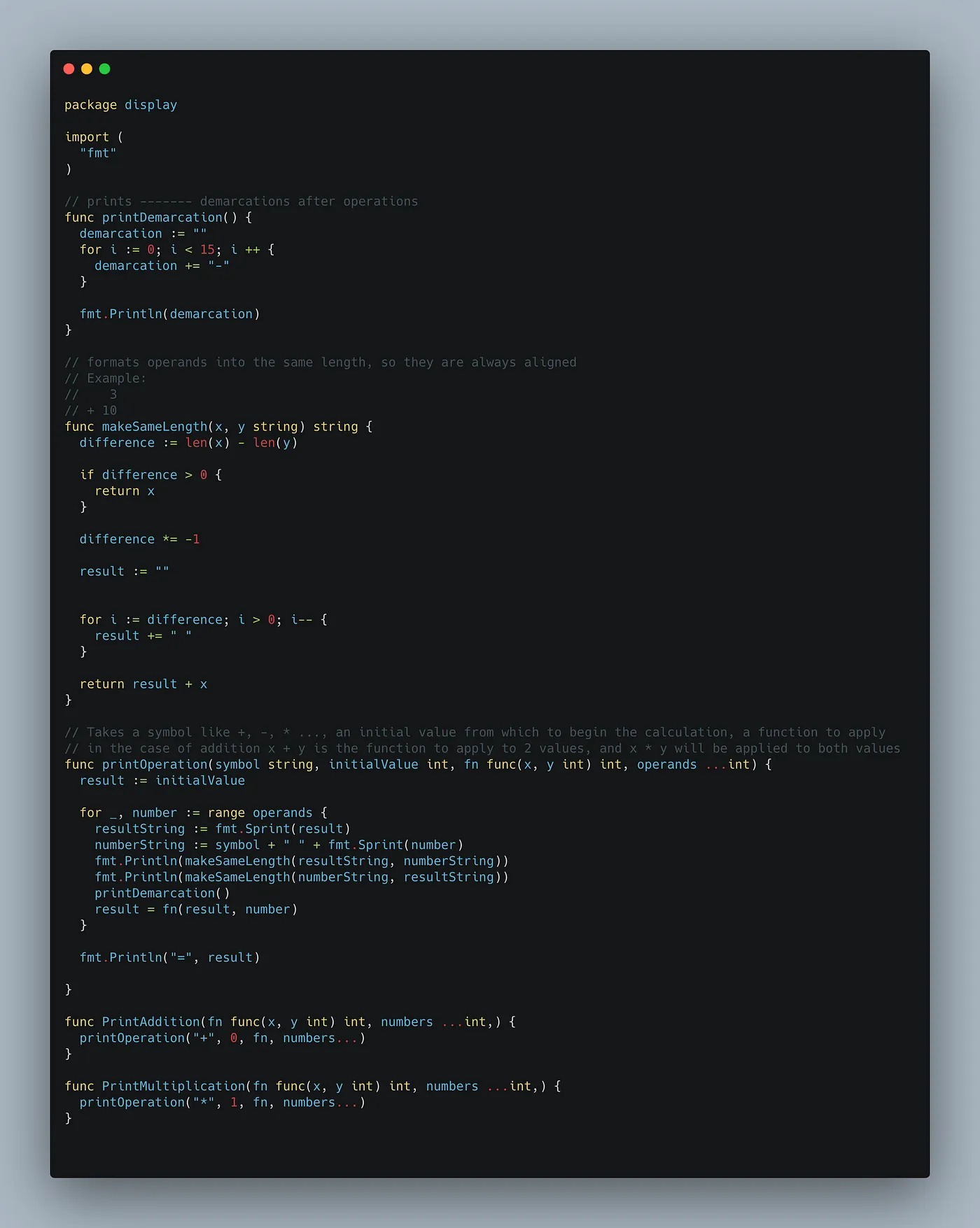 Здесь мы добавили 2 новые функции, которые выводят шаги, используемые в операции — AdditionWithSteps и MultiplicationWithSteps, а также немного рефакторинга.