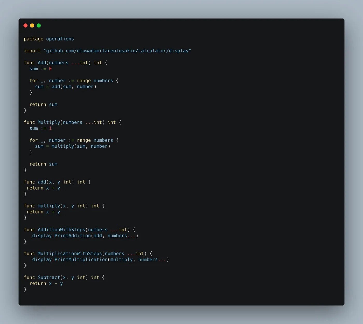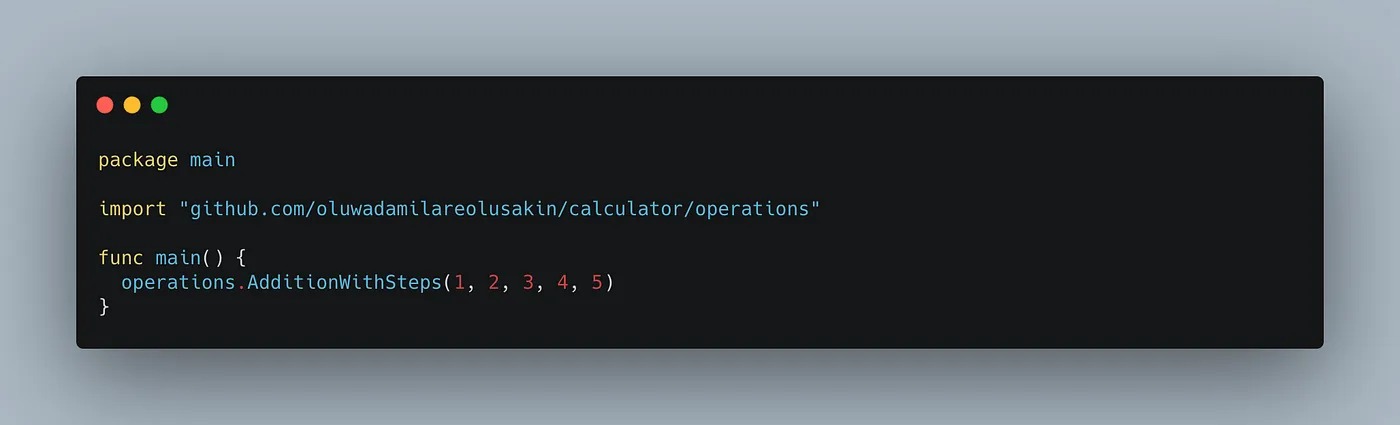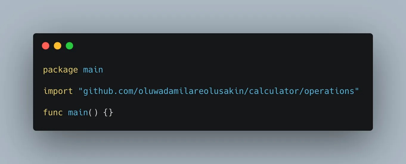 Внутри файла main.go в следующем коде мы импортируем пакет операций, который мы создали ранее в нашем модуле калькулятора.