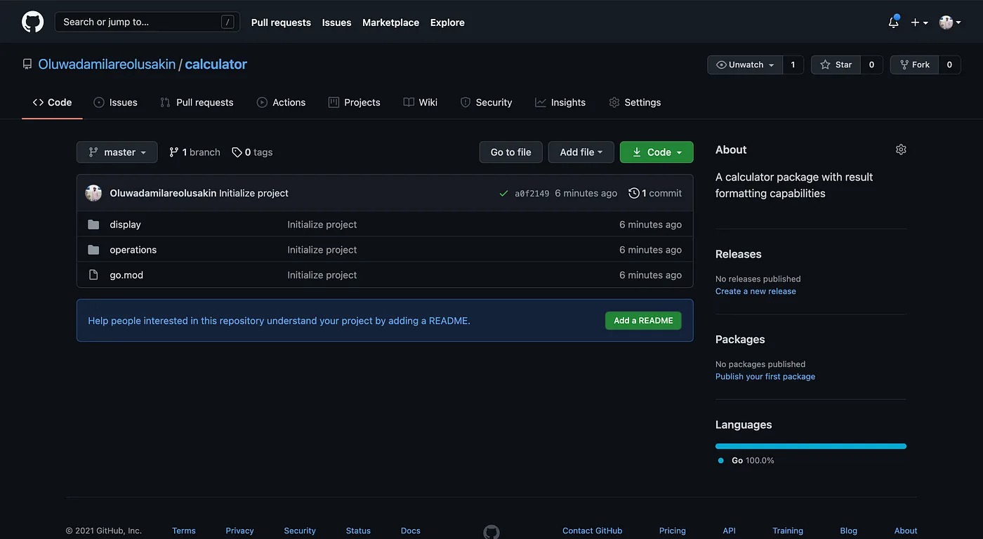 Теперь давайте сделаем этот пакет доступным для использования в других программах на Go. Поместите его в репозиторий, который вы создали для своего проекта. Я использую GitHub для хранения своего проекта, и имя моего репозитория — calculator.