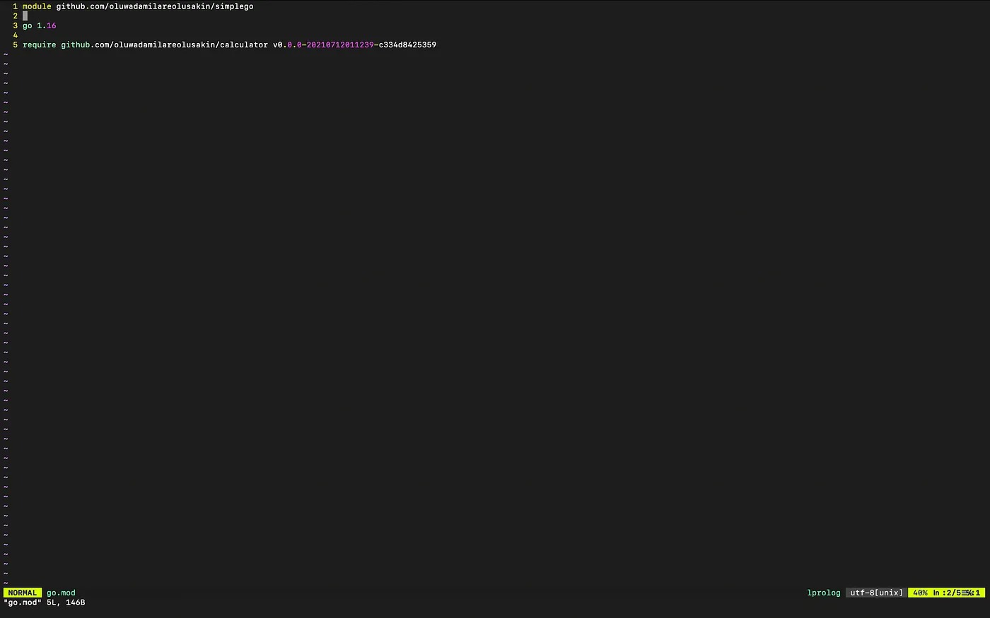 У нас также есть странный файл go.mod. Если вы знакомы с JavaScript, вы можете сравнить его с файлом package.json в ваших проектах или Gemfile в ваших проектах на Ruby. По сути, он содержит информацию, которая описывает модуль — в данном случае модуль калькулятора — и перечисляет зависимости всех пакетов в этом модуле, это может выглядеть примерно так.