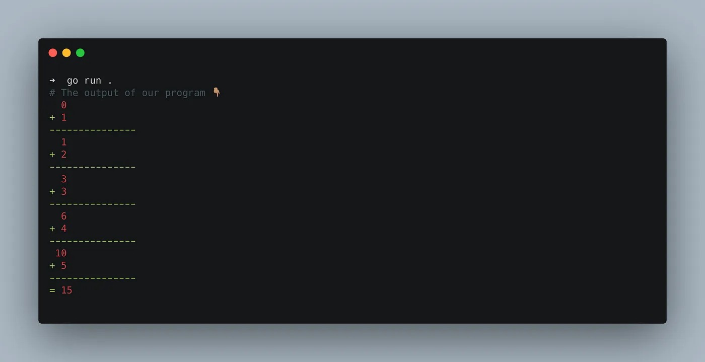 Давайте запустим нашу программу, в терминале выполните следующую команду, и вы увидите, как в окне терминала будут выведены шаги операции 1+2+3+4+5.