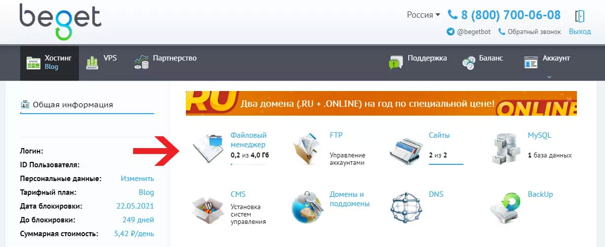 Вам понадобится доступ к вашим файлам public_html. Здесь мы будем использовать файловый менеджер (File Manager) хостинга Beget в качестве примера.