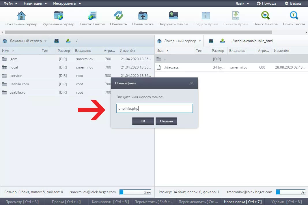 4. Назовите ваш файл phpinfo.php и нажмите Ок.