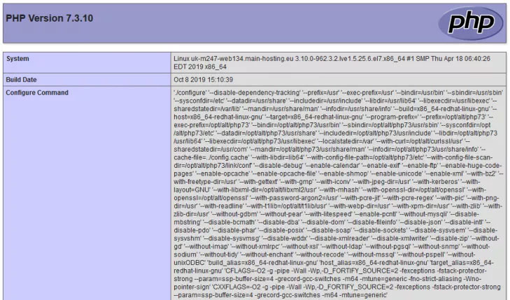 Затем вы будете перенаправлены на страницу с подробной информацией о текущей версии PHP, модулях, значениях и т.д. Прокрутите вниз для просмотра более подробной информации.