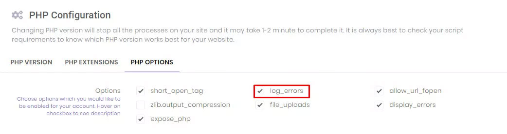 2. Перейдите на вкладку «Параметры PHP» и установите флажок log_errors. Нажмите «Сохранить».