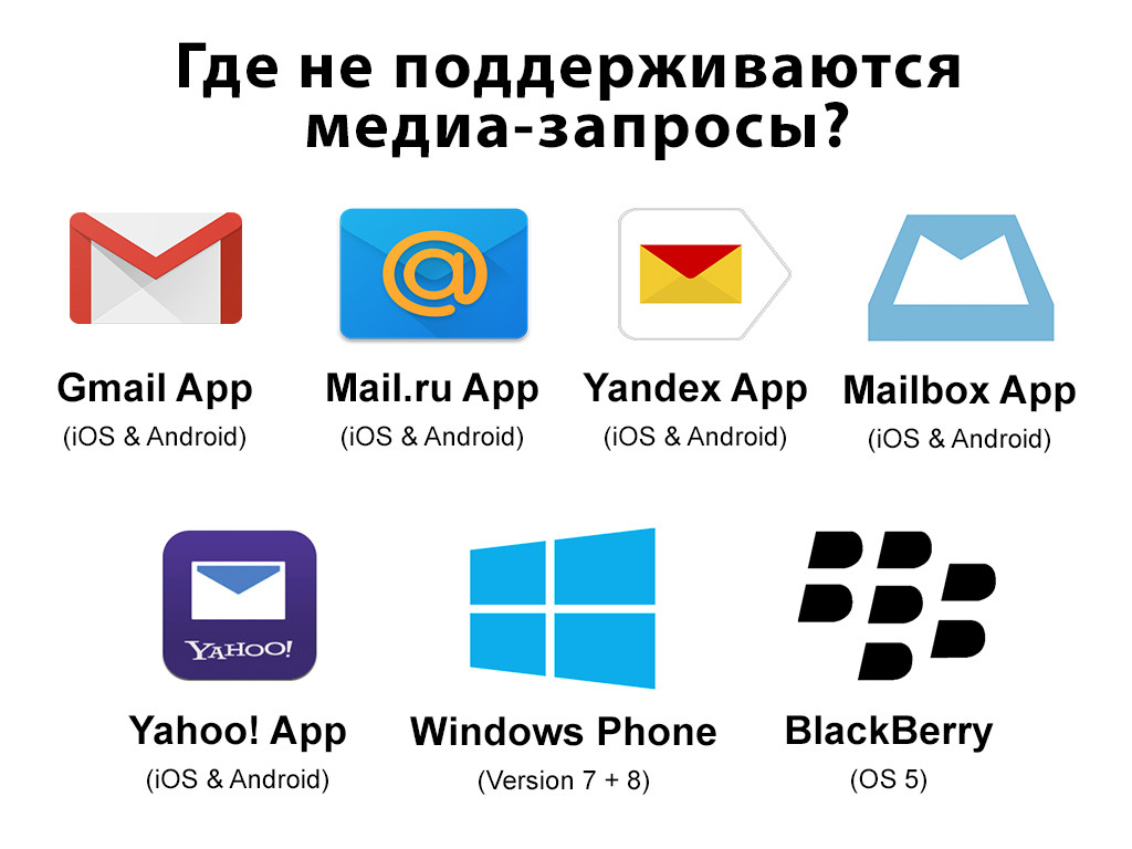 - Yandex mail (web, android) — нет поддержки медиазапросов. На андроид клиенте были замечены погрешности при расчете ширины многоколоночных элементов.