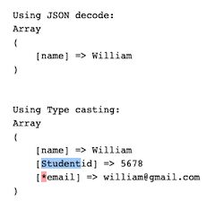 Приведение типов является простым методом преобразования типа входных данных. Второй метод применяет json_decode() к данному объекту. В качестве второго параметра он передает булево true для получения выходных данных в формате массива.