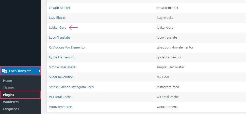 Чтобы перевести плагин с помощью Loco Translate, после установки плагина перейдите в раздел Loco Translate > Plugins. Затем вы увидите список всех переводимых плагинов вашего сайта. Там также будет дополнительная информация о переводе, наиболее важной из которой является текстовый домен плагина. После этого найдите в списке плагин, который вы хотите перевести, и нажмите на него, чтобы продолжить.