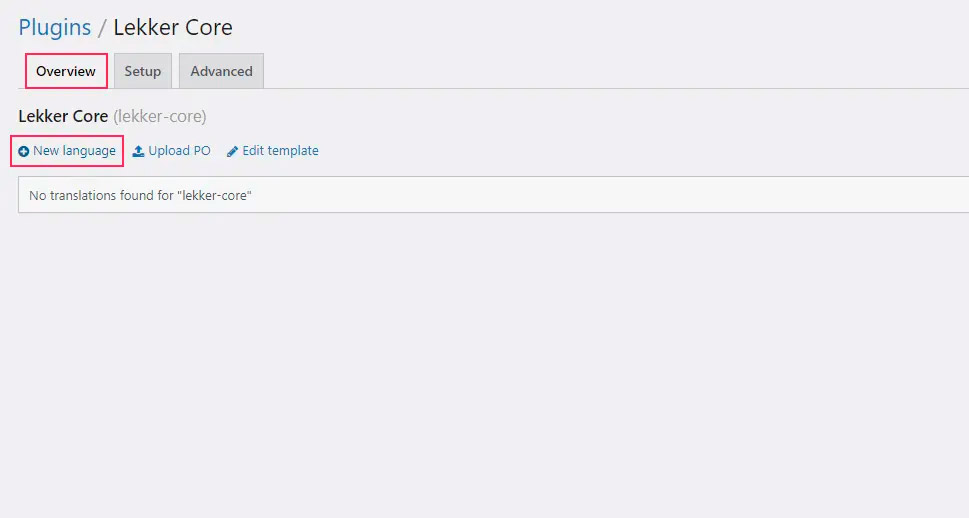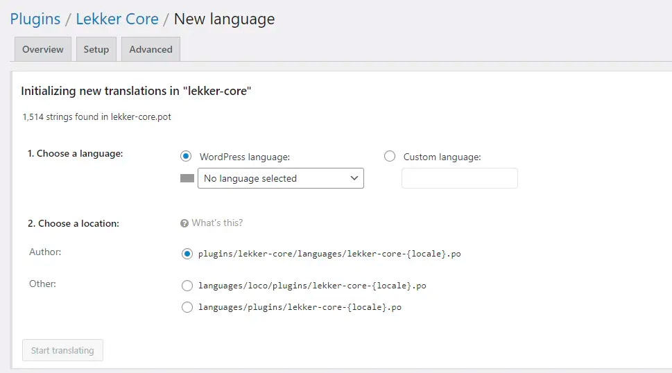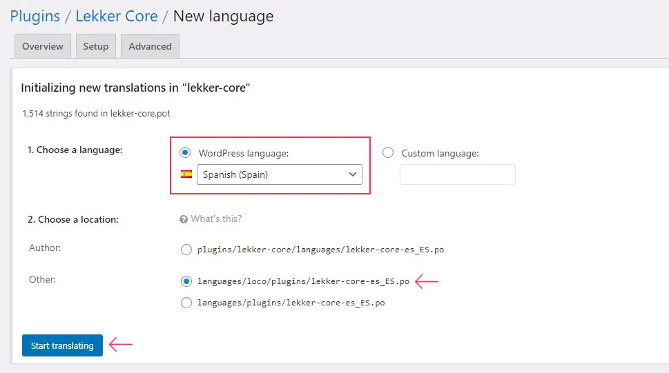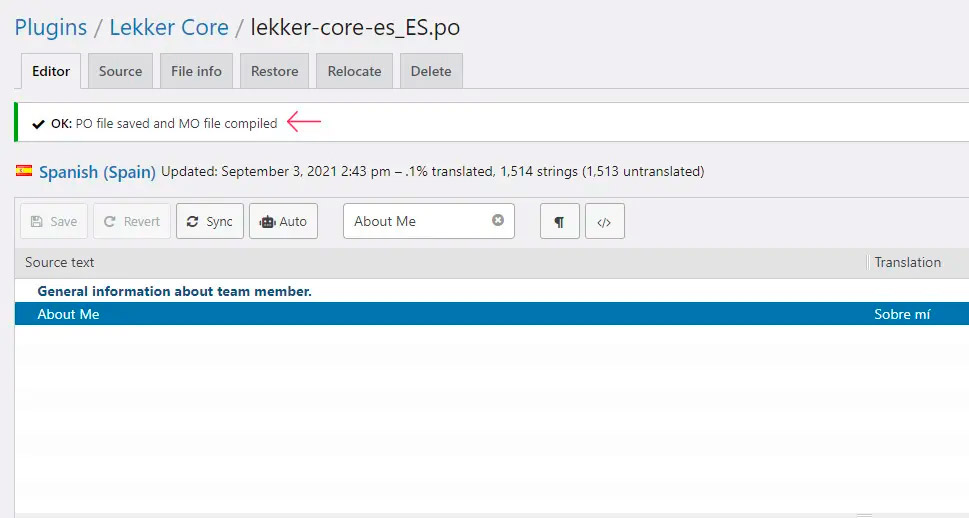 Например, в случае с плагином «Lekker Core» текстовым доменом является lekker-core. Наш целевой язык — стандартный испанский язык, который имеет код языка es_ES. Это означает, что имена файлов будут:
