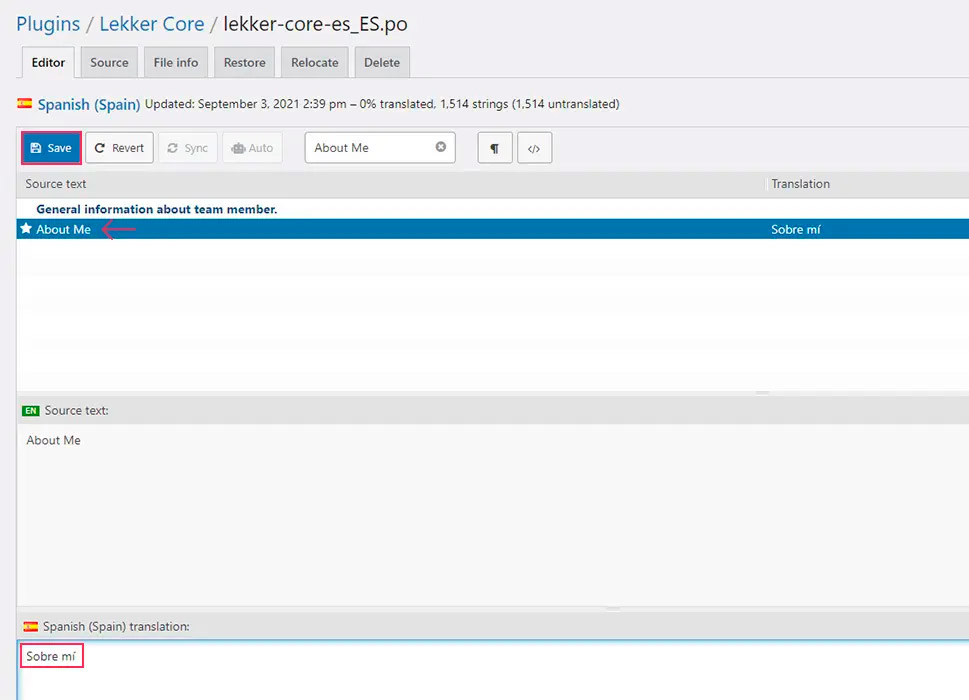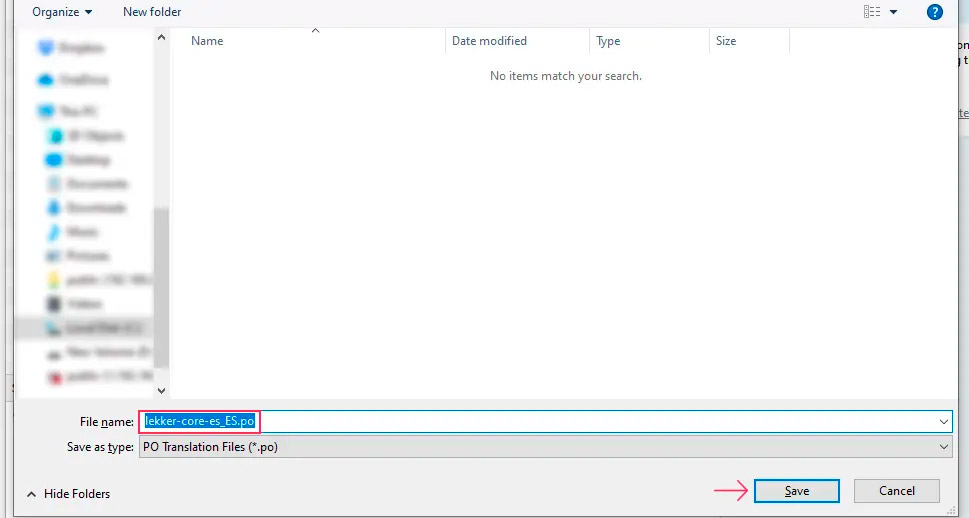 Учитывая, что мы используем плагин Lekker Core и перевод на стандартный испанский язык, наш файл называется lekker-core-es_ES.po. На данном этапе вы также можете изменить место сохранения файла на вашем компьютере. Просто убедитесь, что выбрали более удобное для вас. Затем нажмите кнопку Save, чтобы сохранить файл.