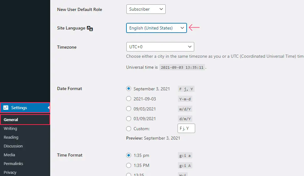 Причина, по которой перевод не появился автоматически, заключается в том, что сначала необходимо изменить язык сайта на язык перевода. Для этого перейдите в раздел Settings > General (Настройки > Общие) и найдите опцию Site Language (Язык сайта).