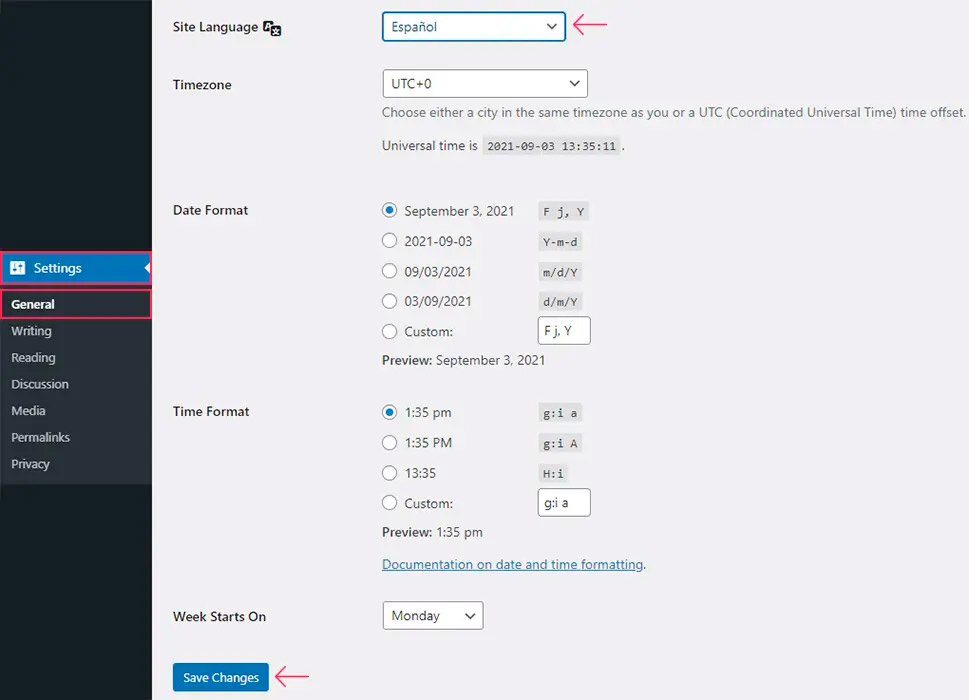 По умолчанию он будет установлен на язык, который вы выбрали при установке WordPress, но вам следует изменить его на язык перевода и нажать кнопку Save Changes (Сохранить изменения), чтобы применить изменения.