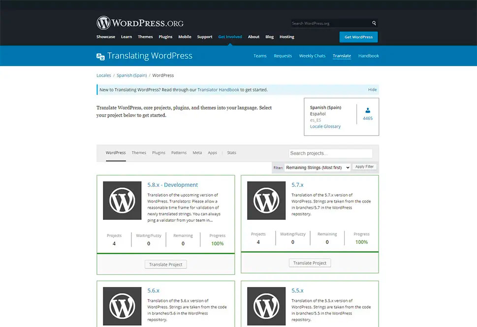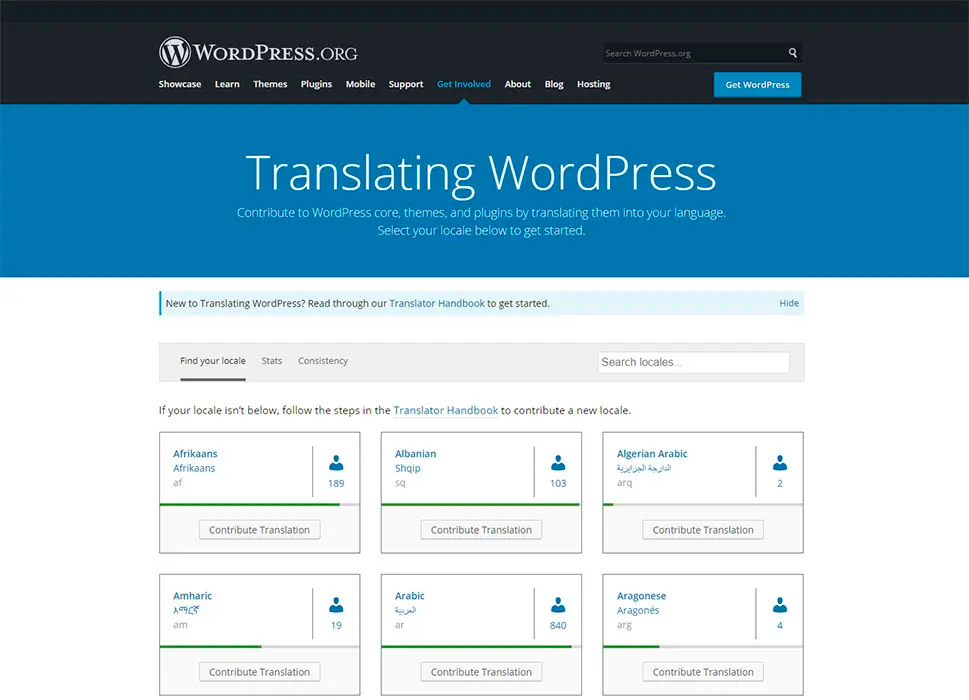 Если вы не видите приглашения перевести плагин на его странице, вы также можете посетить страницу Translating WordPress вручную. Там вы увидите список всех доступных для перевода языков, которые в настоящее время поддерживаются WordPress.