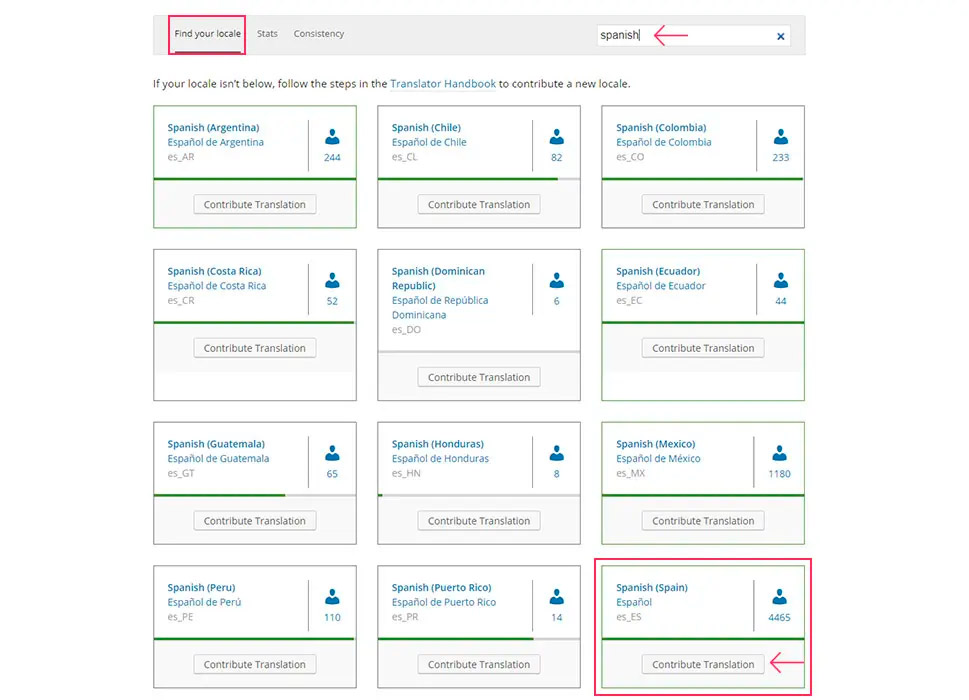 Найдите язык, т.е. локаль, на которую вы хотите перевести конкретный плагин WordPress, и нажмите на ссылку Contribute Translation рядом с ним.