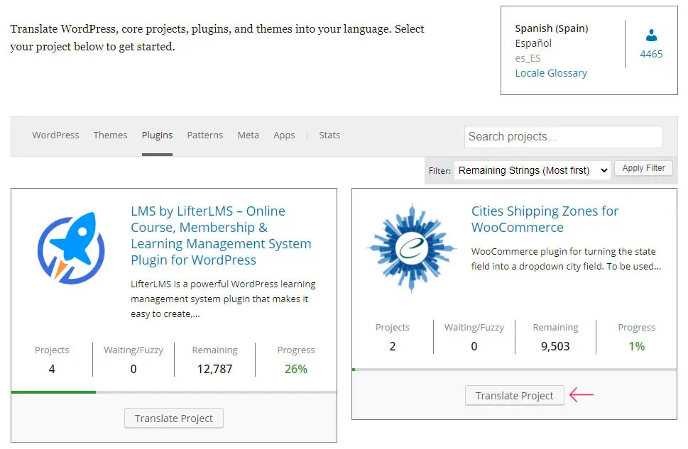 Поскольку в этой статье мы о том, как сделать перевод плагинов WordPress, вам следует выбрать вкладку Plugins. Затем найдите плагин, в который вы хотите внести свои переводы. И нажмите на его ссылку Translate Project, чтобы продолжить с переводом.