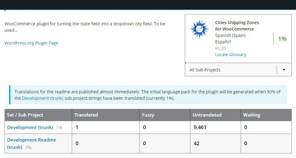 На следующей странице перевода плагина вы увидите список подпроектов, содержащих строки, требующие перевода, а также текущий прогресс перевода этого подпроекта. Выберите подпроект, строки которого вы хотите перевести, и нажмите на него, чтобы продолжить.