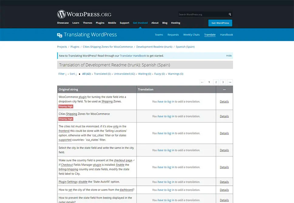Наконец, вы увидите список строк плагина, которые нуждаются в переводе. Однако, чтобы добавить свой перевод этих строк, вам сначала нужно войти в свою учетную запись WordPress.org, как показано на скриншоте ниже.