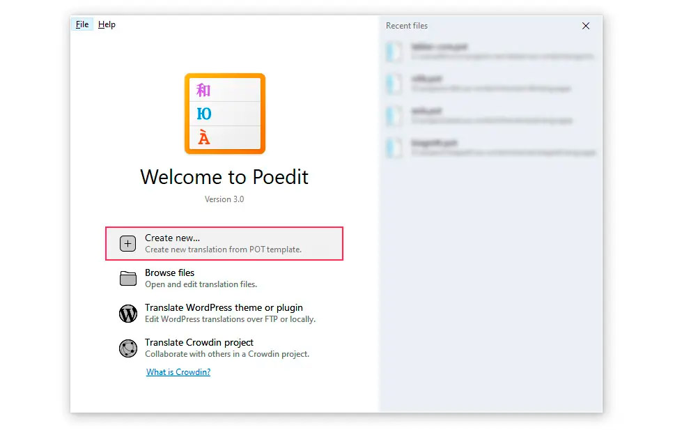 Чтобы создать новый перевод, нажмите кнопку Create new…, которая позволит вам выбрать файл шаблона .pot, используемый в качестве основы для перевода. Кроме того, если вы уже делали некоторые переводы с помощью Poedit, последние использованные файлы переводов будут доступны в разделе «Recent files«.