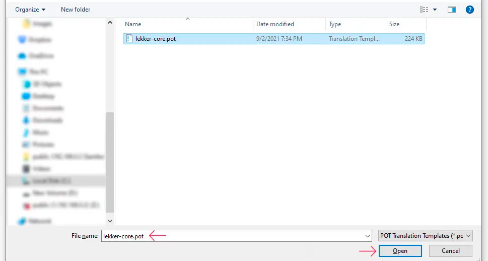 Затем вам нужно будет найти и выбрать файл .pot на вашем компьютере с помощью файлового диалогового окна. Файл .pot плагина — это тот файл, который вы ранее скачали с сервера по FTP из папки языка или локализации плагина. После выбора файла .pot нажмите на кнопку Open, чтобы открыть его в приложении Poedit и начать перевод.