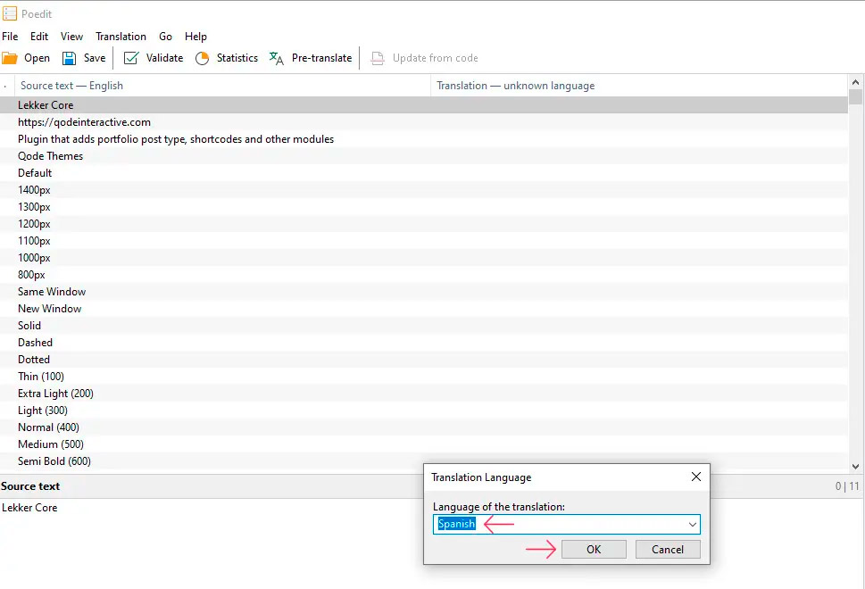 Открыв шаблон .pot в программе Poedit, вы увидите все надписи, доступные для перевода. Кроме того, в появившемся небольшом всплывающем окне вам будет предложено выбрать язык перевода. Выберите язык, на который вы хотите перевести, и нажмите кнопку OK.
