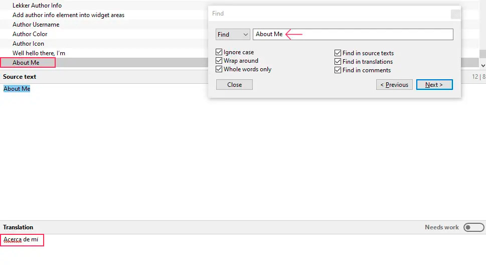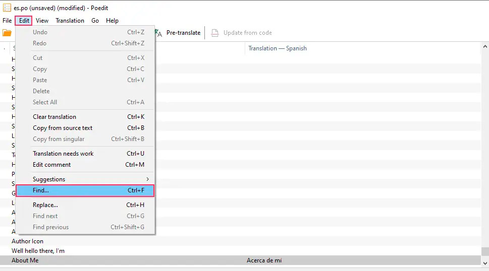 Кроме того, я рекомендую использовать функцию поиска (Find) в приложении Poedit, особенно если вы ищете конкретную надпись. Эта функция доступна при одновременном нажатии клавиш Ctrl/Cmd и F на клавиатуре или при переходе к пункту Edit -> Find… в опциях программы.