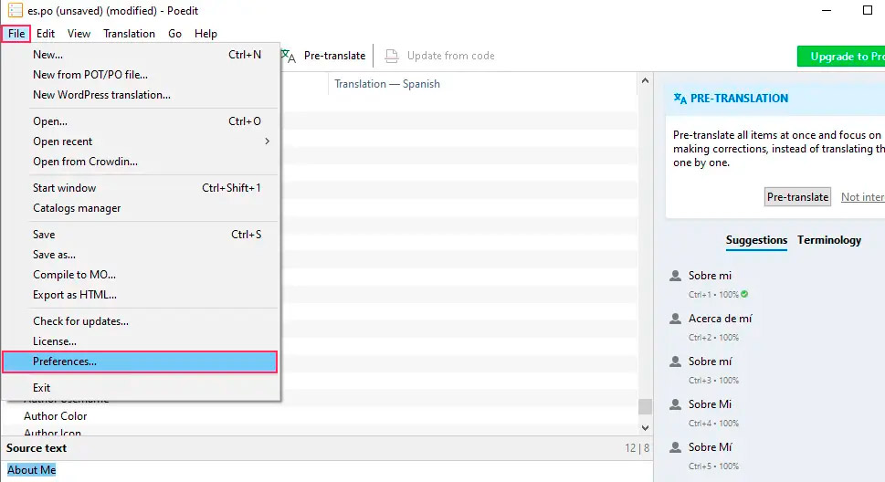 После того как вы сделали необходимые переводы, пришло время сохранить файл. Однако, поскольку переводы WordPress требуют файл с расширением .mo, вам необходимо убедиться, что при сохранении файла .po будет создан соответствующий файл .mo. Для этого перейдите в раздел File -> Preferences… (Файл -> Параметры…).