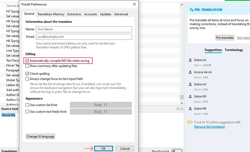 Откроется новое всплывающее окно, содержащее различные дополнительные опции приложения, которые вы можете установить. Нас интересует опция Automatically compile MO file when saving (Автоматически компилировать MO-файл при сохранении). Найдите эту опцию и убедитесь, что флажок рядом с ней установлен. Затем нажмите кнопку OK, чтобы сохранить настройки и выйти из всплывающего окна.