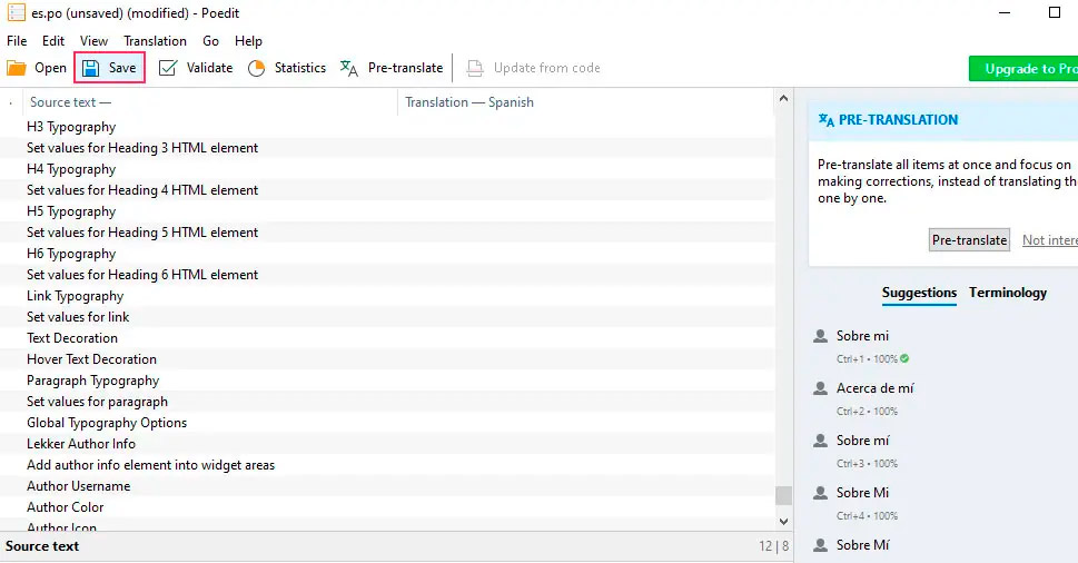 После этого вы можете сохранить файл, нажав на опцию Save, расположенную в верхней части окна Poedit.