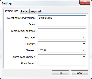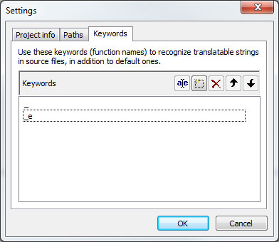 4. Перейдите на вкладку Keywords (ключевые слова) и введите _ и _e для ключевых слов (они были использованы в шаге 2 локализации темы)