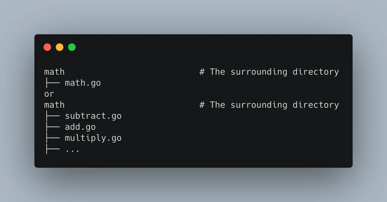 Пакет — это файл или группа файлов с пространством имен и некоторым кодом или связанным с ним кодом. Это означает, что пакет может находиться в одном файле, например math.go, или в нескольких файлах, таких как add.go, subctract.go, multiply.go, то есть во многих файлах или в одном файле, например, с именем package math.