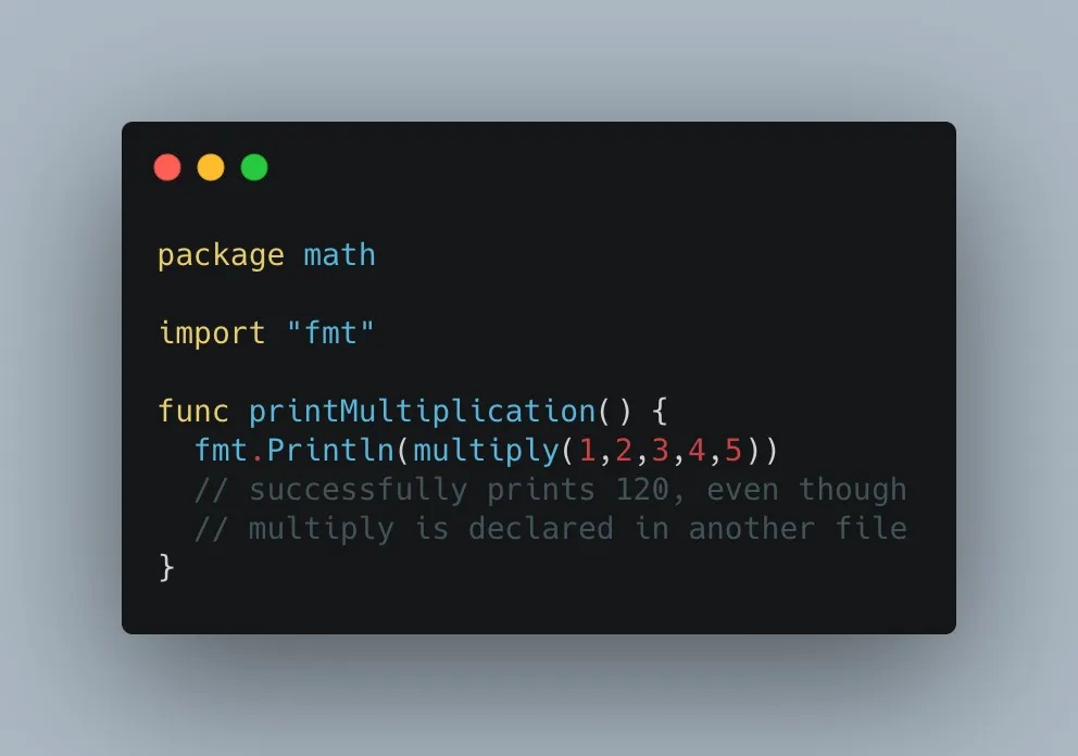 Если мы решили разбить этот математический пакет на несколько файлов, мы можем создать три файла add.go, subctract.go, multiply.go со следующим содержимым…