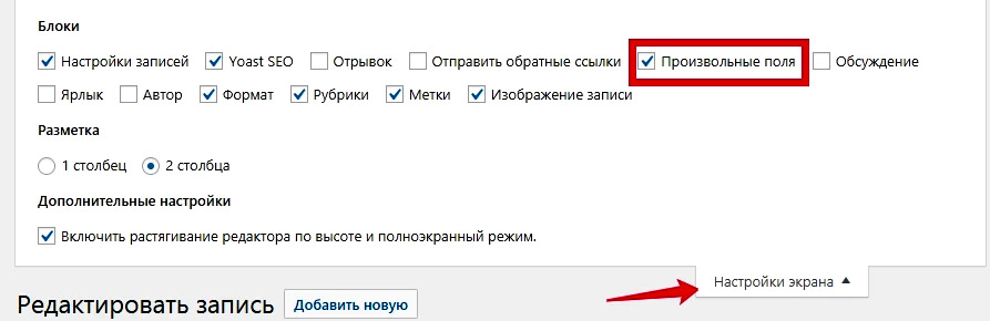 Для классического редактора мы в самом верху жмем на «Параметры экрана» и в появившемся окне ставим нужную галочку напротив «Произвольные поля».