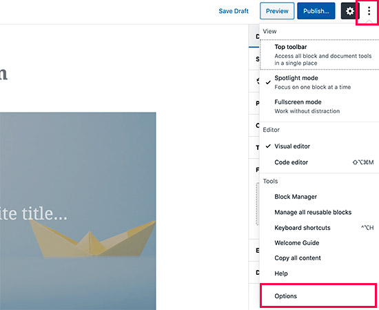 В Гутенберге в правом верхнем углу кликаем на иконку с тремя вертикальными точками. Выбираем «Предпочтения» (Options).
