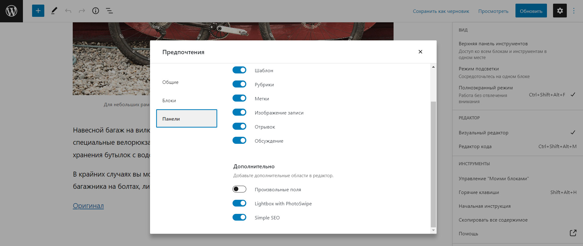 Затем выбираем «Панели» (Panels) и в «Дополнительно» (Additional) видим переключатель включения «Произвольные поля» (Custom Fields):