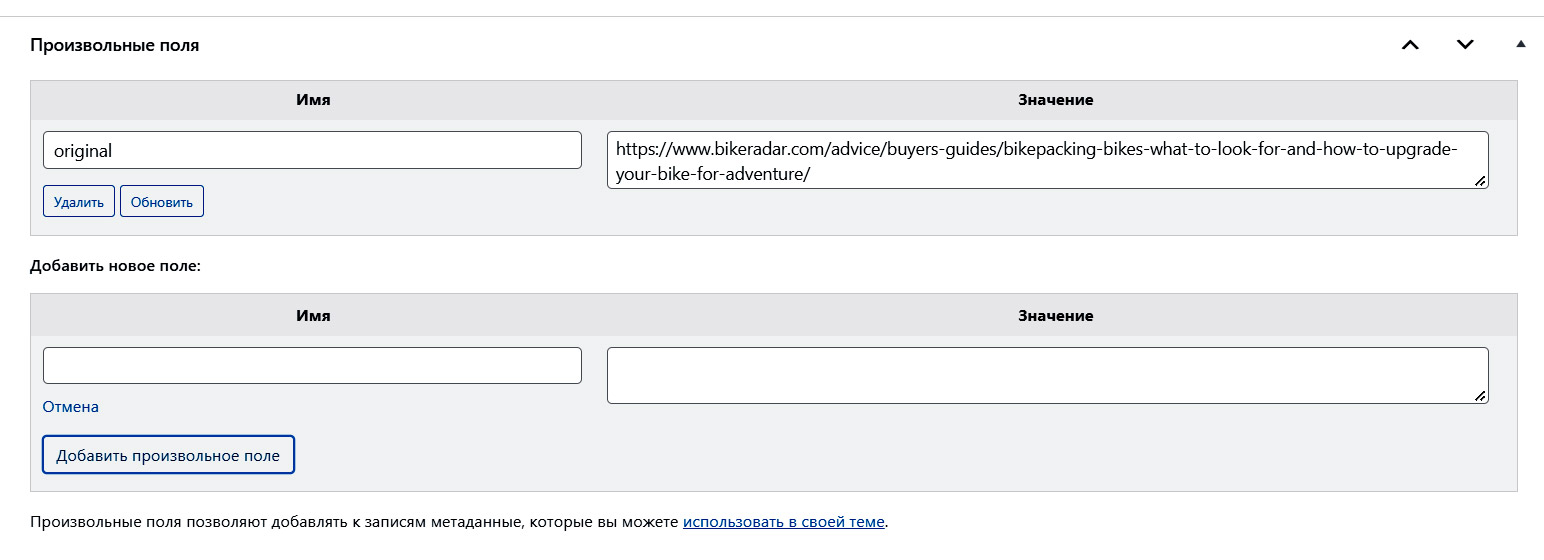 Простыми словами, произвольное поле — это блок с дополнительной информацией, которую можно добавить к, практически, любой записи в WordPress. Ниже я покажу как создание произвольного поля помогает добавить ссылку на оригинал статьи, если запись является переводом с другого языка.
