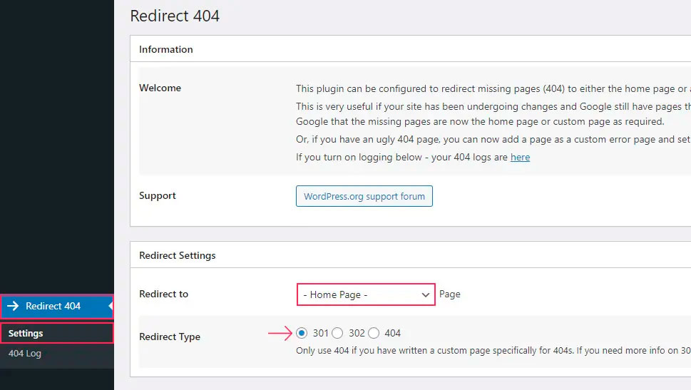 После установки и активации плагина перейдите в раздел Redirect 404 -> Settings (Настройки). Опции, наиболее важные для данной статьи, находятся в подразделе Redirect Settings (Настройки перенаправления).