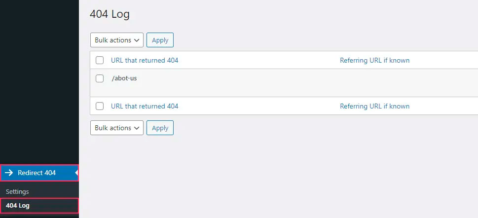 Затем вам следует проверить функциональность нового добавленного перенаправления, попытавшись получить доступ к ошибочно введенному URL на вашей странице. Вы должны быть перенаправлены на домашнюю страницу, а попытка будет показана в разделе Redirect 404 -> 404 Log, если вы ранее включили регистрацию ошибок 404.